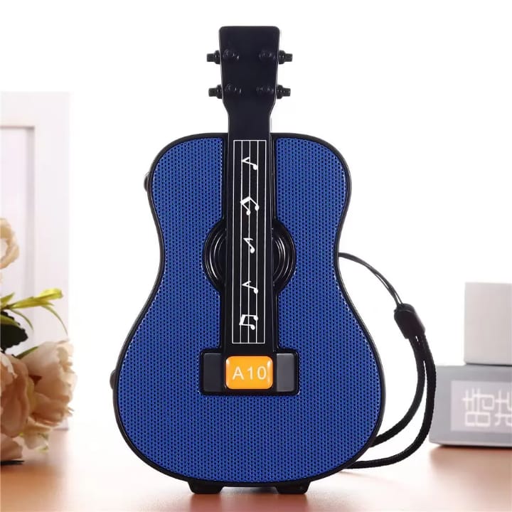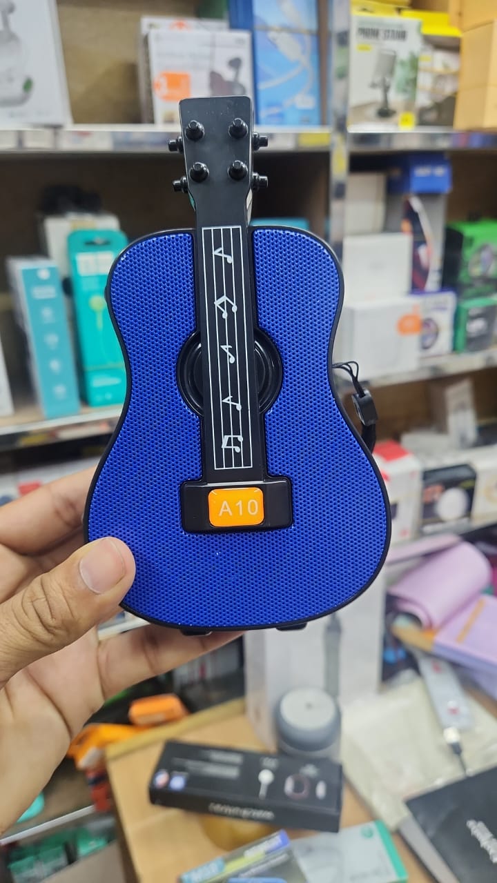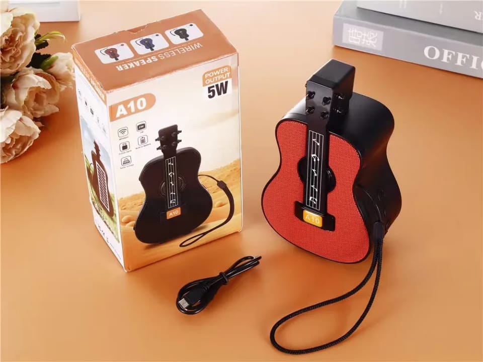 This A10 is a mini speaker system that appears with a Guitar design. It has a stereo sound system & Karaoke singing function. It has a 5W power function. It also features a built-in microphone, memory card, and a 1-3 hour battery charging time, various audio codecs & Bluetooth v5.3 connection.